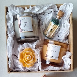 - Kit com Aromas e Café: Um kit presente em caixa de madeira personalizada com velas perfumadas e café