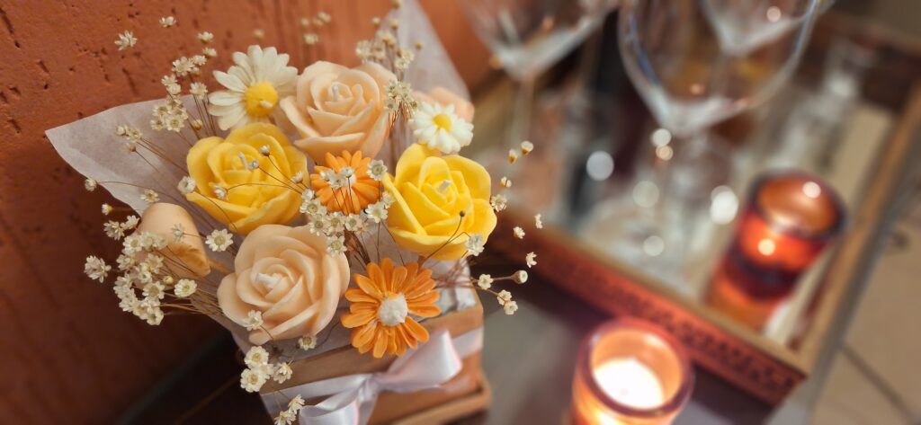 - Kit com Vela Aromática, Sabonete e Sachê para Armários: Além de perfumarem, trazem uma sensação de bem-estar e cuidado com os convidados e eternizar – através do cheiro – aquele momento especial.