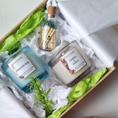 - Caixa de presente com vela temática (Ex: Doce Alquimia, Café ou Pistache)